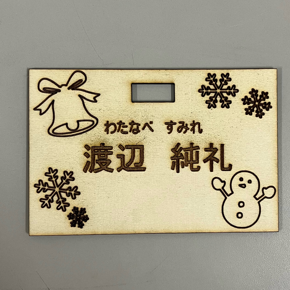 私は、アイドルグループのSnow Manが好きなので冬っぽい感じに、見る人がSnow Man好きを覚えてくれたらいいなと思って作りました。小さい結晶が丸焦げにならないようにレーザーを設定するのが難しかったです。自分が好きなシンプルな感じにできて良かったです。
